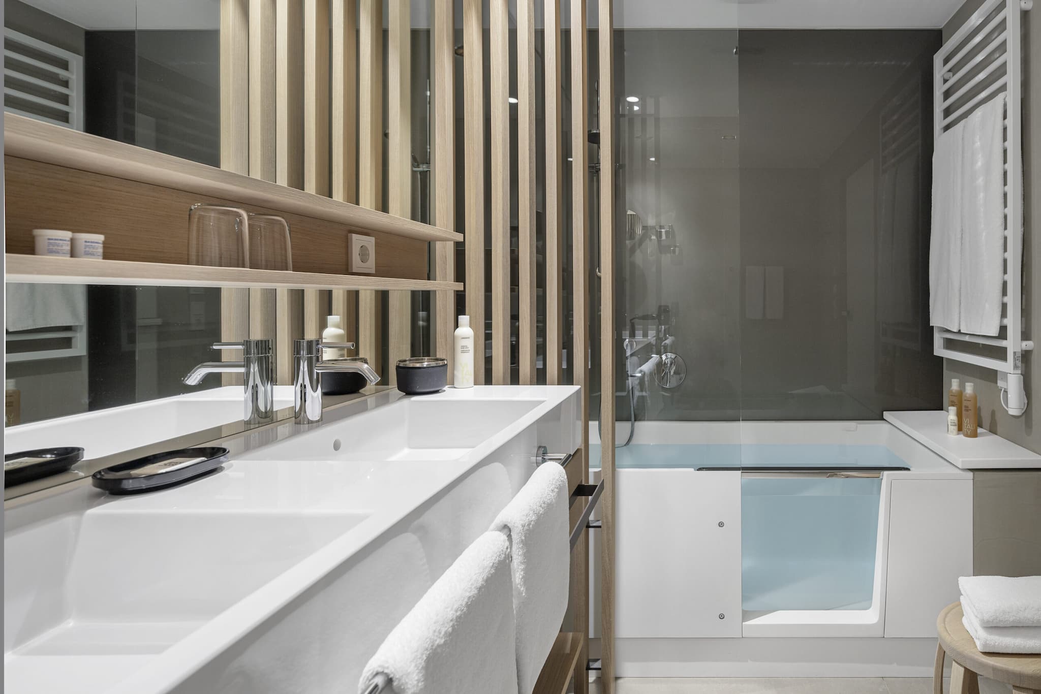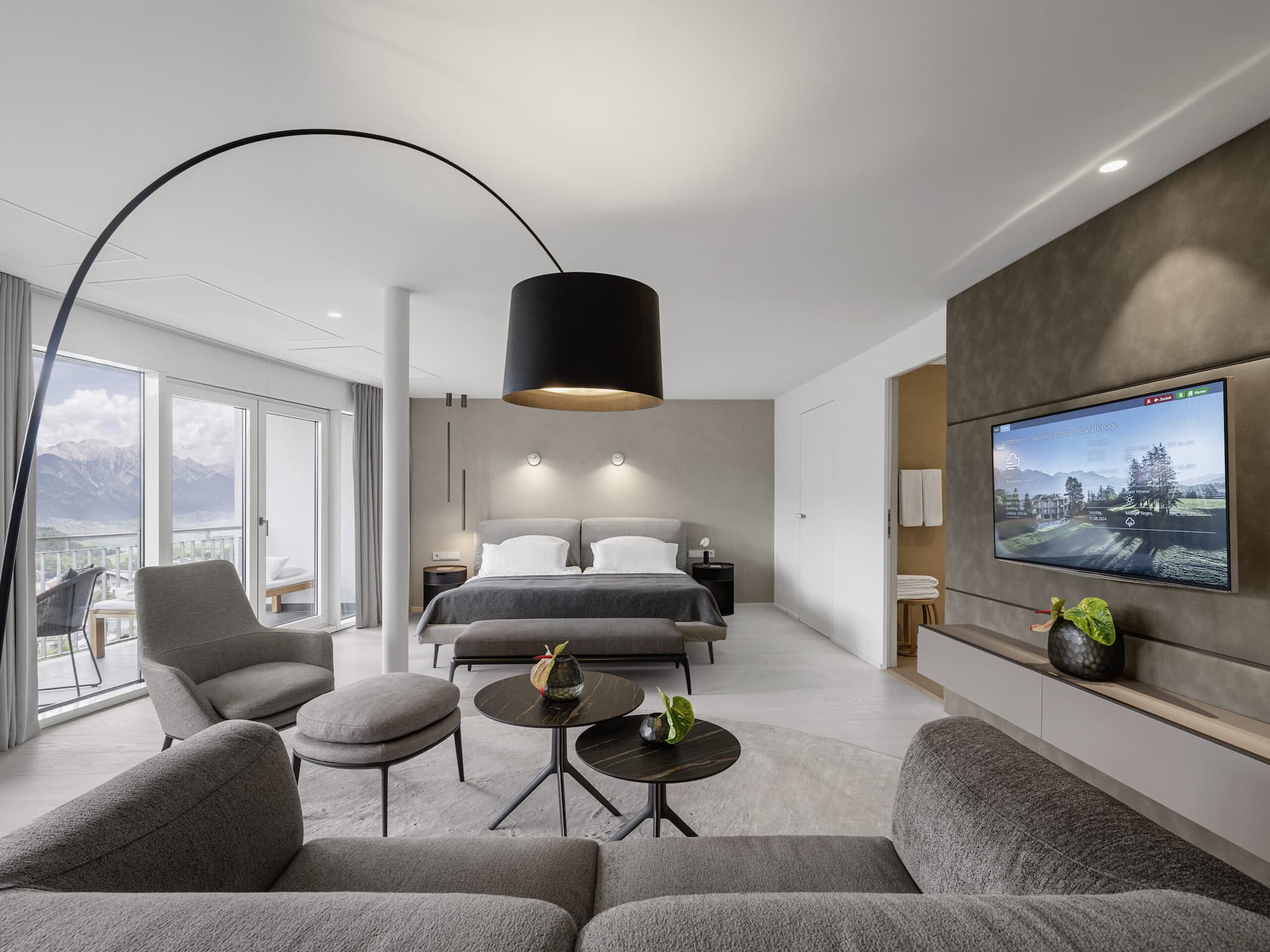Großzügiges Appartement für 2 Personen, 45 m², Schlaf- / Wohnbereich mit Twinbed und 2 Sofas, Schreibtisch, begehbarer Schrank, Balkon, Bad mit Badewanne und separates WC.