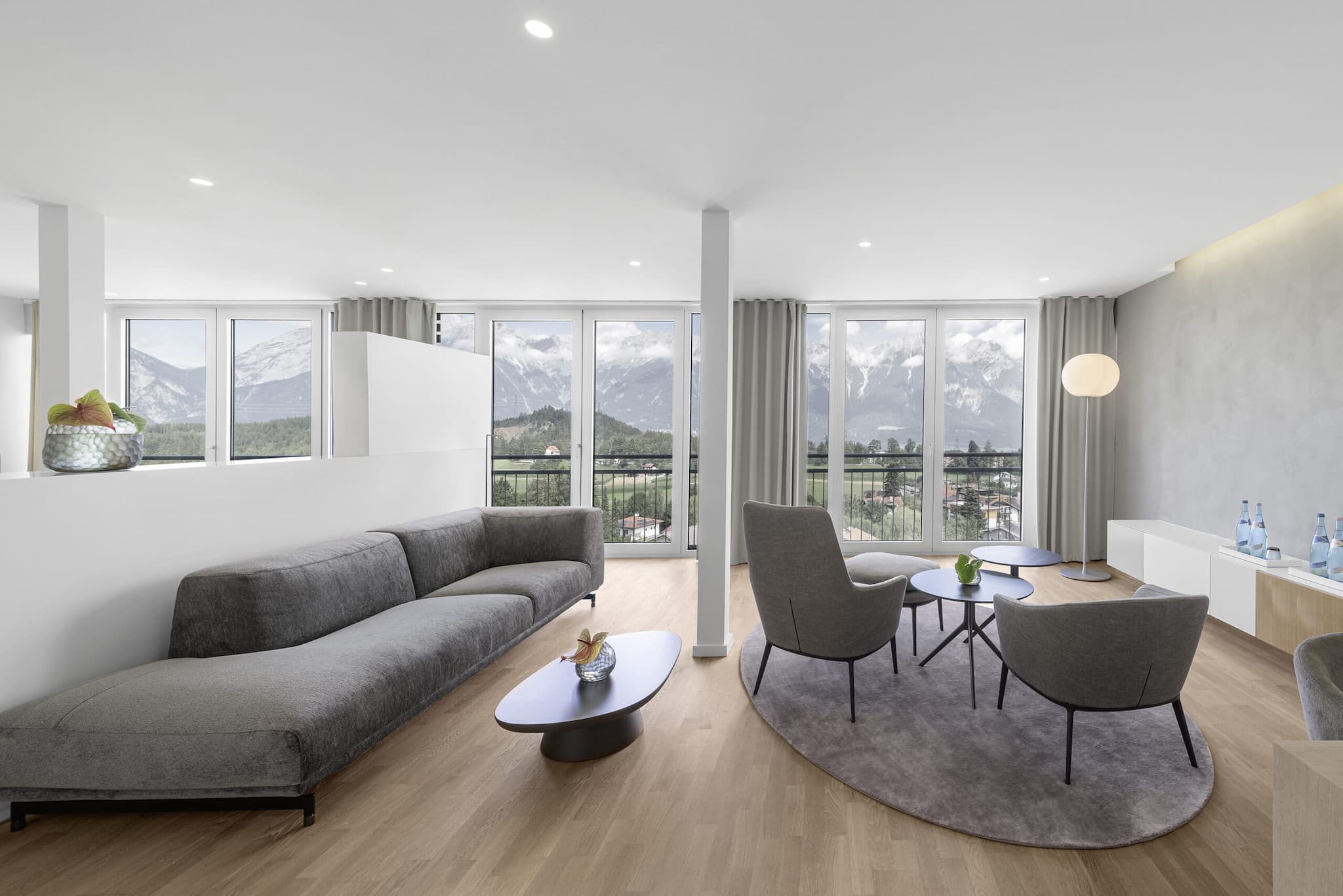 Sehr großzügige Suite für zwei Personen (55–70 m²) auf der Nordseite mit traumhaftem Bergblick. Offener Wohn-, Schlaf- und Badbereich, ausgestattet mit Sofa, Chaiselongue, Schreibtisch und begehbarem Kleiderschrank, modern eingerichtet und mit elegantem Parkettboden versehen.