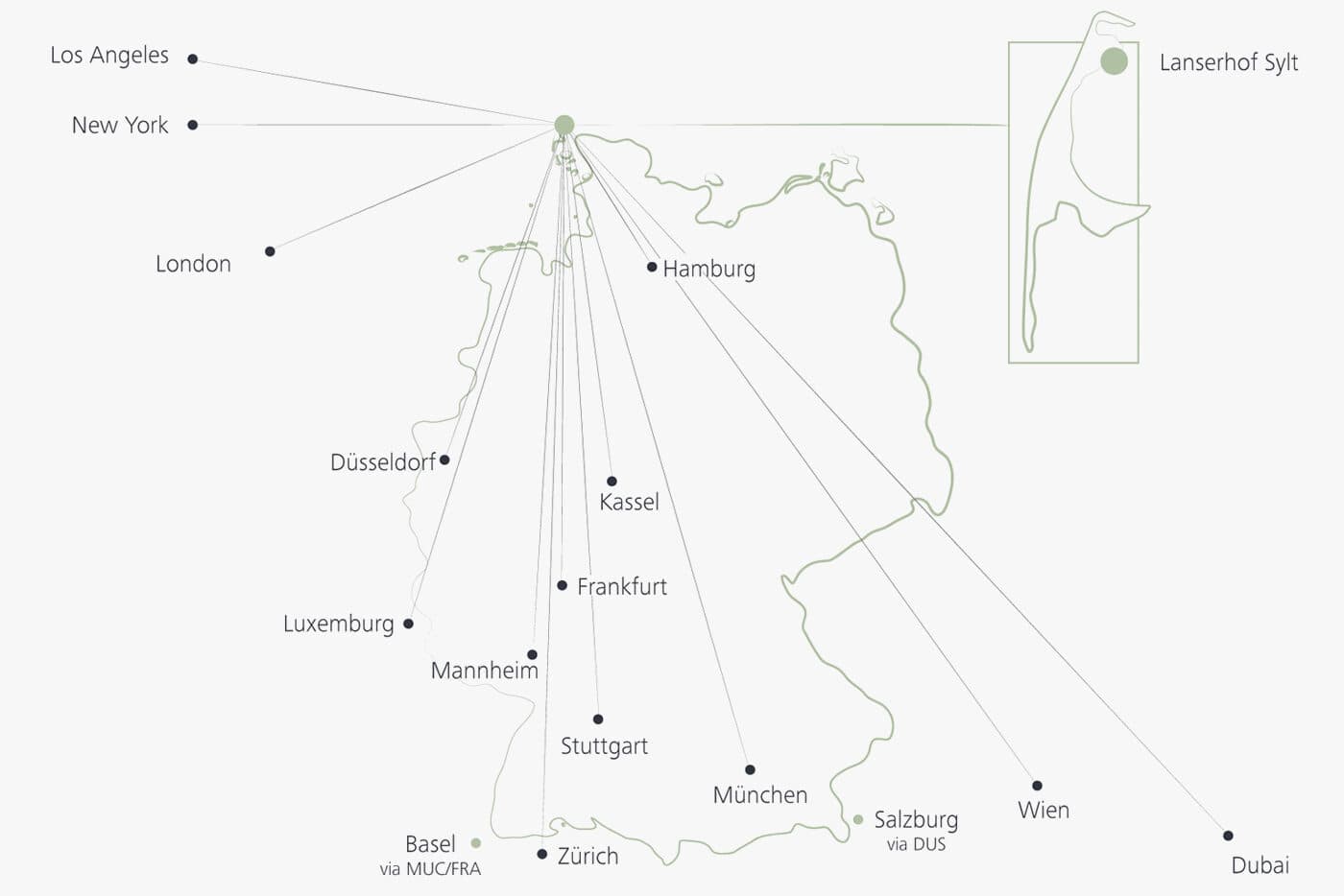 Haben Sie den Wunsch vom Bahnhof Westerland abgeholt zu werden, organisieren wir gerne einen kostenlosen Limousinenservice für Sie. Der Lanserhof Sylt ist ca. 15 km vom Bahnhof Westerland entfernt.