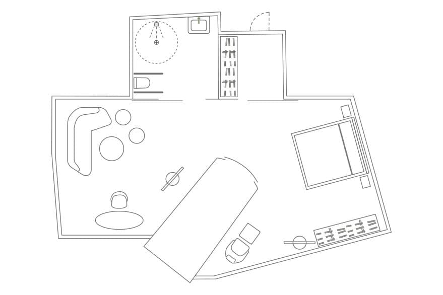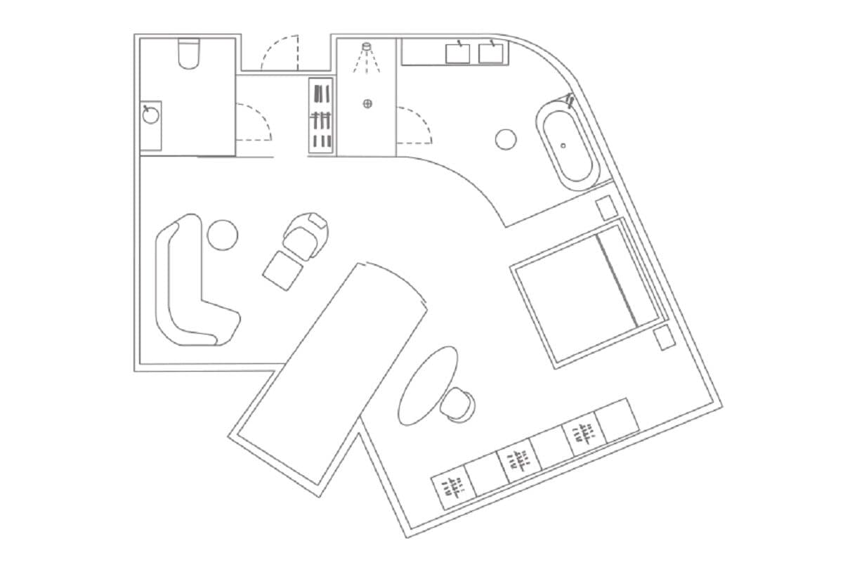 54 m² großes Doppelzimmer mit Loggia und optionalem Meerblick, offener Wohn- und Schlafbereich, hochwertige Couch, innovative FreshBed-Technologie*, gesundheitsförderndes Lichtkonzept*, große Couch, Schreibtisch, Bad mit Badewanne und Dusche, separates WC, Ecklage, Parkett, Elektrosmog-Freischaltung/keine Klimaanlage, freier WLAN-Internetzugang, 55“-TV, Smart-TV, Safe.