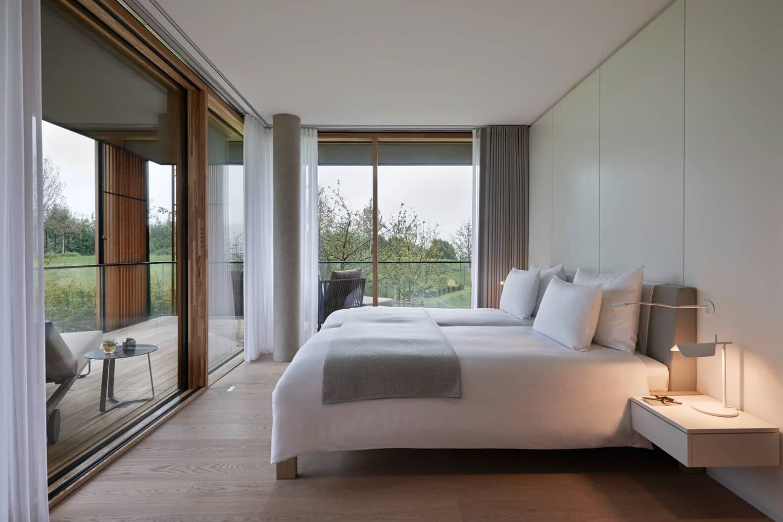100 m² große Suite mit Panorama-Ausblick auf den Golfplatz und das Tegernsee-Tal, drei Balkonterrassen, Vorraum mit Garderobe, Hauptschlafzimmer mit großzügigem Bad (freistehende Badewanne, Doppelwaschbecken, Dusche, WC), zweites Schlafzimmer mit eigenem Bad (Dusche, WC) und Wohnzimmer mit offenem Kamin, Parkett, freier WLAN-Internetzugang, Teestation, Safe, 55″-TV, Video-On-Demand, Radio, Elektrosmog-Freischaltung