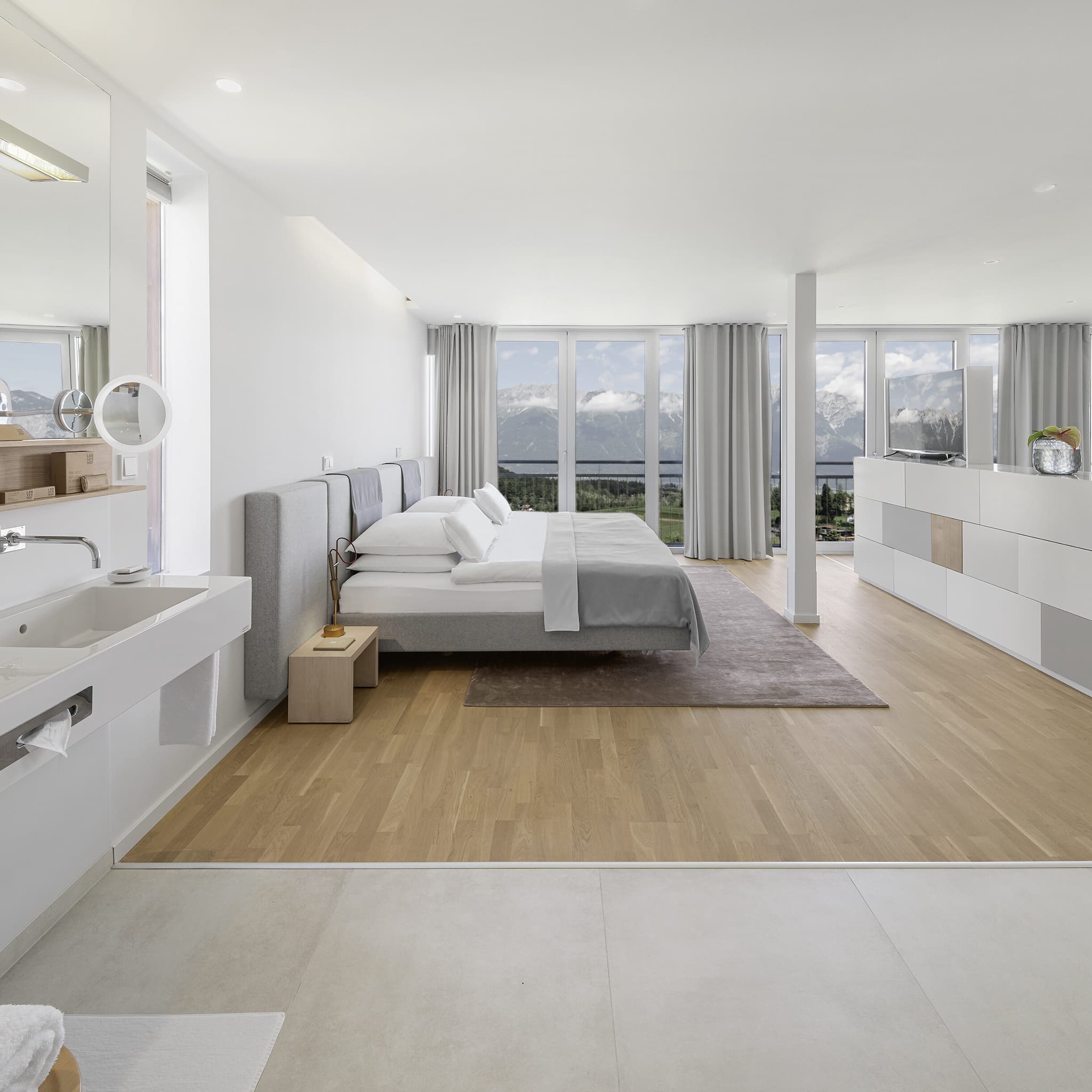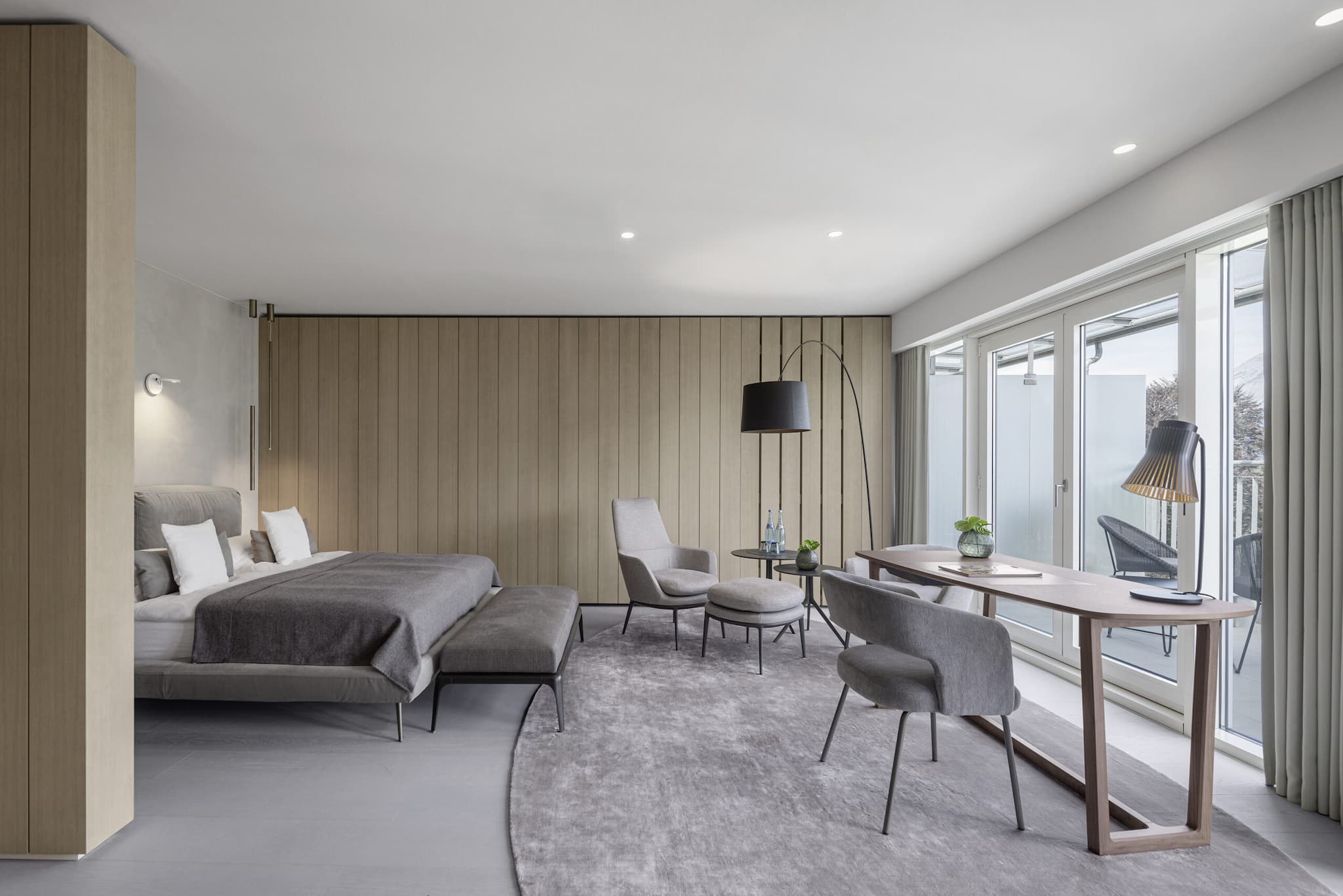 The design of our rooms focusses on you as our guest. In our generously proportioned rooms and suites you will soon find your own place of tranquillity. Flowing forms, rooms flooded with light and harmonious colours. The architecture welcomes you with open arms.