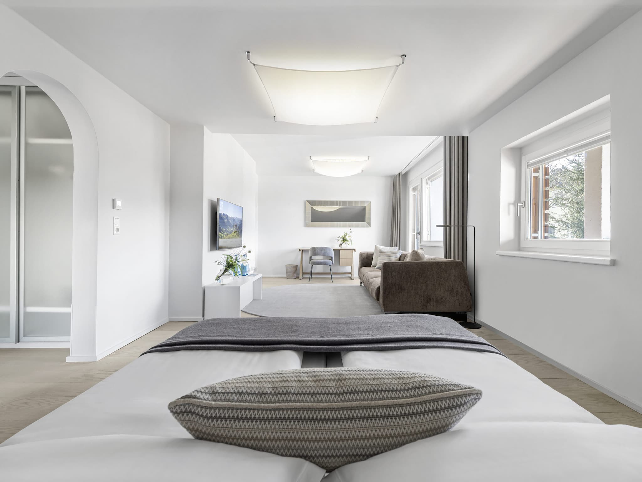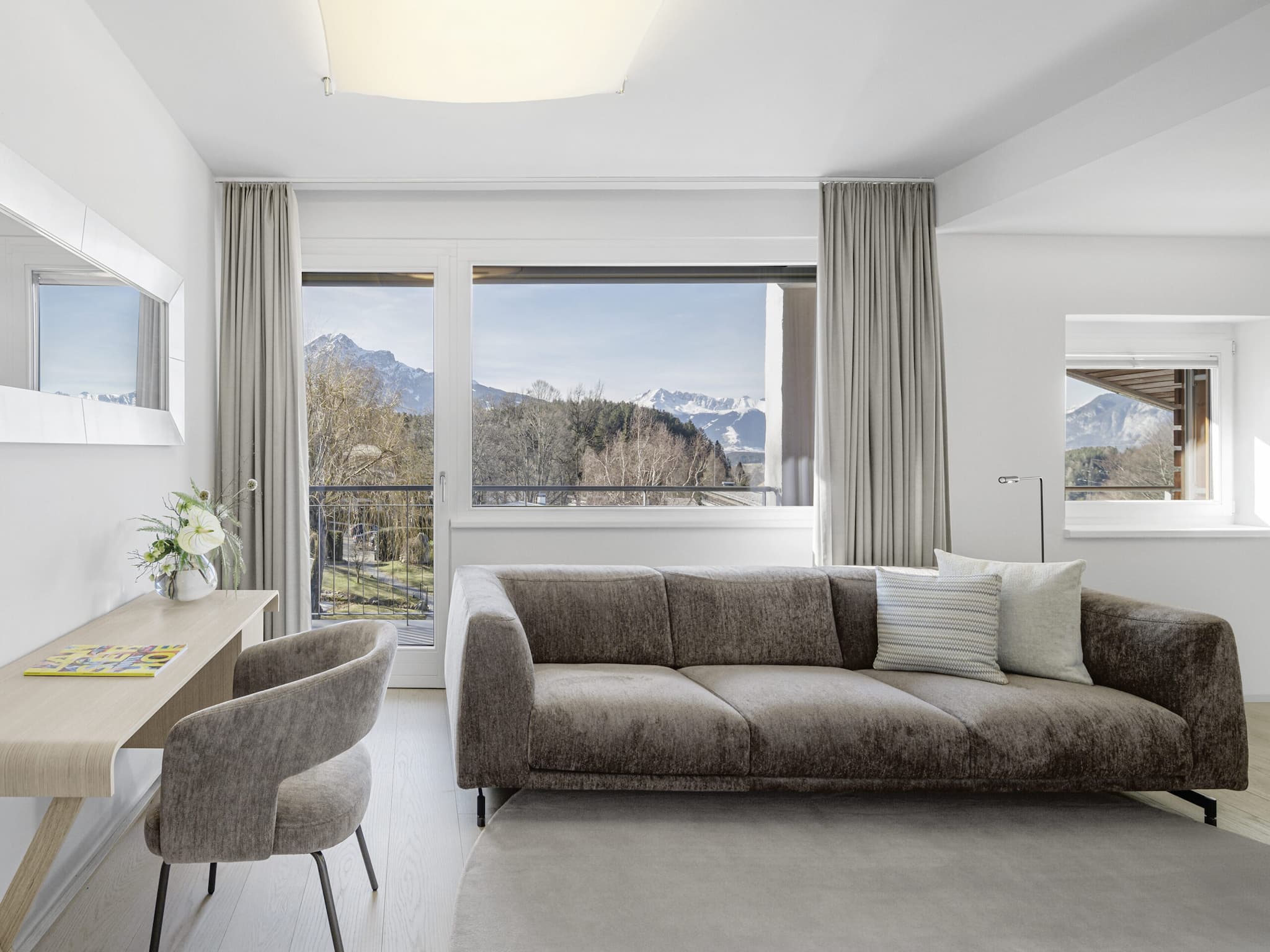 Spacious double rooms measuring 55 to 58 m², featuring a combined living and sleeping area with views of the garden or the Nordkette mountain range. Enjoy the tranquillity and the greenery from your private balcony.